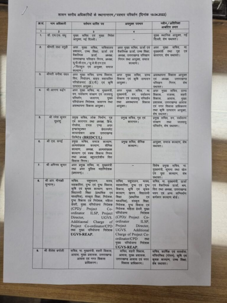 देहरदून, खबर न्यू इंडिया (न्यूज़ डेस्क): मुख्यमंत्री पुष्कर सिंह धामी ने लम्बे इंतेज़ार के बाद 22 IAS की पहली तबादला लिस्ट जारी कर दी है । अपर मुख्य सचिव आनंद बर्द्धन की मुख्यमंत्री कार्यालय से विदाई हो गई है। उनकी जगह सीएम दफ्तर की कमान अब अपर मुख्य सचिव राधा रतूड़ी संभालेंगी। सत्ता की कमान संभालने के बाद मुख्यमंत्री पुष्कर सिंह धामी ने अपने पहले प्रशासनिक फेरबदल में दो महिला आईएएस अधिकारियों पर भरोसा जताया है। त्रिवेंद्र राज में मुख्यमंत्री कार्यालय की कमान संभाल चुकी राधा रतूड़ी एक बार फिर चतुर्थ तल की जिम्मेदारी संभालेंगी। वहीं, सचिव राधिका झा को स्वास्थ्य एवं चिकित्सा शिक्षा सरीखा अहम जिम्मा दिया गया है। वह विशेष आयुक्त नई दिल्ली के पद पर भी बनी रहेंगी। मुख्यमंत्री पुष्कर सिंह धामी सरकार के दूसरे कार्यकाल का पहला प्रशासनिक फेरबदल मंगलवार देर रात हो गया। शासन ने भारतीय प्रशासनिक सेवा (आईएएस) के 22 अधिकारियों के विभाग बदल दिए हैं। अपर मुख्य सचिव आनंद बर्द्धन की मुख्यमंत्री कार्यालय से विदाई हो गई है। उनकी जगह सीएम दफ्तर की कमान अब अपर मुख्य सचिव राधा रतूड़ी संभालेंगी। रतूड़ी त्रिवेंद्र सरकार में भी मुख्यमंत्री कार्यालय में तैनात रहीं। आईएएस अधिकारी डॉ. पंकज पांडेय से स्वास्थ्य एवं चिकित्सा शिक्षा व सचिव का प्रभार हटा दिया गया है। वह हाल ही में एक महिला चिकित्सक के तबादले को लेकर चर्चाएं में थे। डॉ. पांडेय को सचिव औद्योगिक विकास, औद्योगिक विकास (खनन) आयुष व आयुष शिक्षा सरीखे अहम विभाग दिए गए हैं।