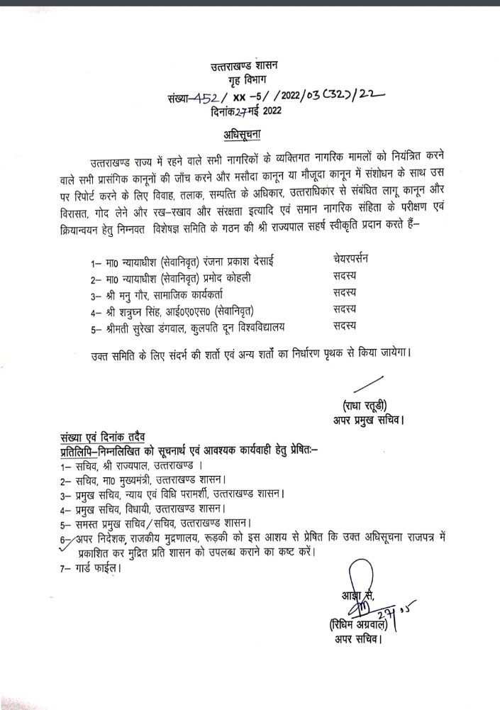 देहरादून, खबर न्यू इंडिया (न्यूज़ डेस्क): उत्तराखंड में धामी सरकार ने एक बड़ा फैसला लेते हुए ऐलान किया कि यूनिफॉर्म सिविल कोड के लिए 5 सदस्यीय कमेटी का गठन किया जाता है. रिटायर जस्टिस रंजना देसाई को कमेटी की चेयर पर्सन बनाया गया है। यह कमेटी तय करेगी कि कानून किस तरह का होगा। सेवनिवृत्त जज रंजना देसाई के नेतृत्व में बनी पांच सदस्यी कमिटी में रिटायर जज प्रमोदी कोहली, सामाजिक कार्यकर्ता मनु गौर, रिटायर आईएएस अधिकारी शत्रुध्यन सिंह और दून विश्वविद्यालय की कुलपति सुरेखा डंगवाल को शामिल किया गया है।