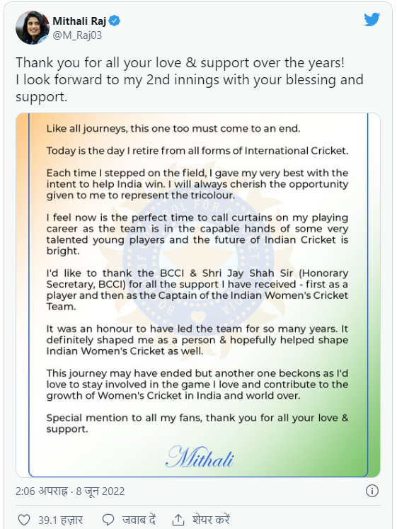 मिताली राज ने इंटरनेशनल क्रिकेट को कहा अलविदा