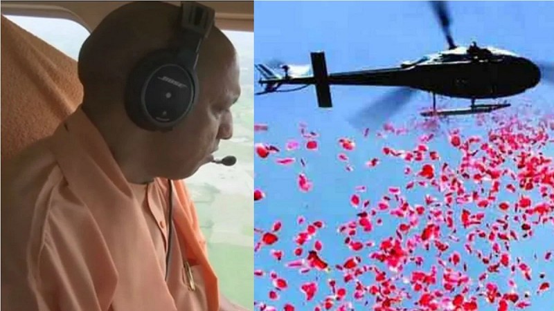 मुख्यमंत्री योगी आदित्यनाथ ने कांवड़ियों पर हैलीकॉप्टर से बरसाये फूल