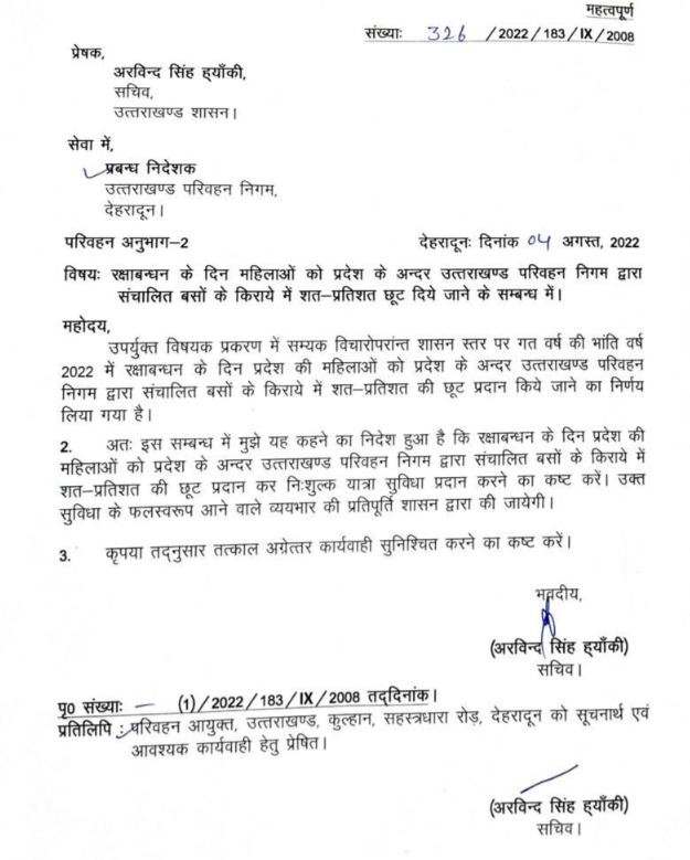 देहरादून, खबर न्यू इंडिया (न्यूज़ डेस्क): मुख्यमंत्री पुष्कर सिंह धामी के निर्देश पर रक्षाबन्धन के दिन प्रदेश की महिलाओं को प्रदेश के अंदर उत्तराखण्ड परिवहन निगम द्वारा संचालित बसों में निःशुल्क यात्रा सुविधा प्रदान की जायेगी। इस संबंध में सचिव अरविन्द सिंह ह्यांकी द्वारा आदेश जारी किये गये हैं। रक्षाबंधन के पर्व पर इस बार भी महिलाओं को सरकार ने रोडवेज बसों में निशुल्क बस यात्रा का तोहफा दिया है। इस घोषणा के तहत छूट का लाभ केवल राज्य के भीतर यात्रा करने पर ही मिल सकेगा।