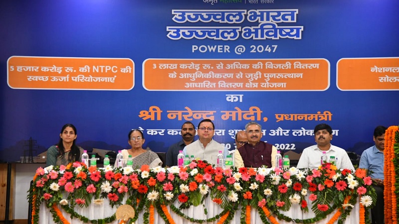 देहरादून,खबर न्यू इंडिया (न्यूज़ डेस्क) : प्रधानमंत्री नरेंद्र मोदी ने शनिवार को वीडियो कॉन्फ्रेंसिंग के माध्यम से आजादी के अमृत महोत्सव के तहत ’उज्ज्वल भारत उज्ज्वल भविष्य - पावर/2047’ के समापन समारोह कार्यक्रम में पुनर्निर्मित वितरण क्षेत्र योजना का शुभारंभ किया। एनटीपीसी की विभिन्न हरित ऊर्जा परियोजनाओं का शिलान्यास तथा लोकार्पण एवं नेशनल रूफटॉप सोलर पोर्टल को भी प्रधानमंत्री द्वारा लांच किया गया। मुख्यमंत्री पुष्कर सिंह धामी ने मुख्यमंत्री आवास स्थित मुख्य सेवक सदन में इस कार्यक्रम में वर्चुअल प्रतिभाग किया। कार्यक्रम में केन्द्रीय मंत्री, विभिन्न राज्यों के मुख्यमंत्री भी जुड़े थे।