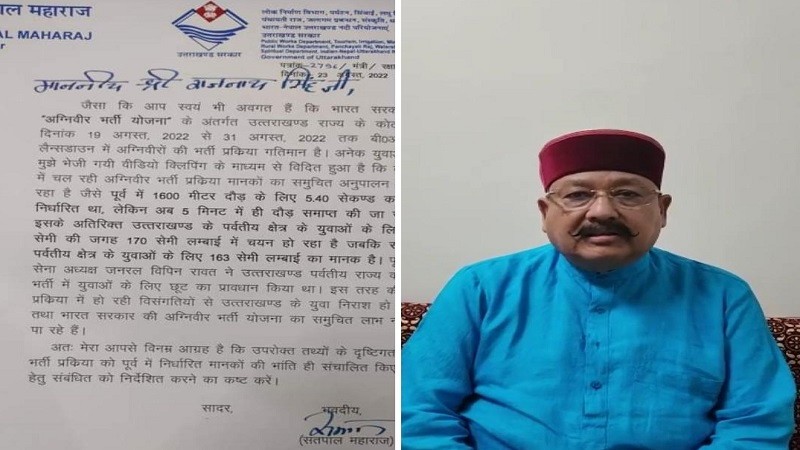 अग्निवीर भर्ती को लेकर मंत्री सतपाल महाराज ने रक्षा मंत्री और रक्षा राज्य को लिखा पत्र
