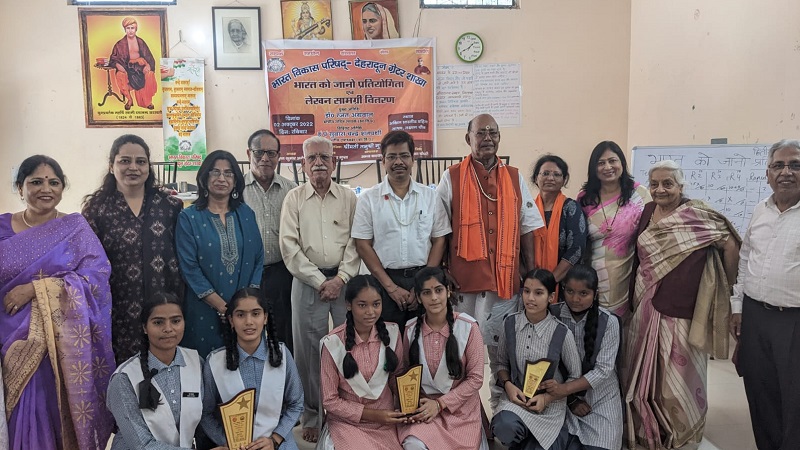 देहरादून, खबर न्यू इंडिया (न्यूज़ डेस्क) : भारत विकास परिषद देहरादून ग्रेटर शाखा द्वारा भारत को जानो प्रतियोगिता के द्वितीय चरण अन्तरविधायलिय का आयोजन अखिल भारतीय महिला आश्रम, लक्ष्मण चौक मे आयोजित किया गया। कनिष्ठ वर्ग मे 7 विधालयों एवं वरिष्ठ वर्ग मे 6 विथालयों की टीम ने भाग लिया। वरिष्ठ वर्ग मे फूल चन्द नारी शिल्प मन्दिर कन्या इण्टर कालेज की टीम प्रथम, महाबीर जैन महिला इण्टर कालेज द्वितीय, श्री गुरु नानक पब्लिक गर्ल्स इंटर कालेज तृतीय स्थान प्राप्त किया। कनिष्ठ वर्ग में अखिल भारतीय महिला आश्रम की प्रथम, महाबीर जैन महिला इण्टर कालेज द्वितीय, श्री गुरु नानक पब्लिक गर्ल्स इंटर कालेज तृतीय स्थान प्राप्त किया। कार्यक्रम के मुख्य अतिथि आई आई टी रूड़की के प्रोफेसर एवँ भारतीय विकास परिषद के क्षेत्रीय सचिव डॉ रजत अग्रवाल रहे उन्होंने शाखा द्वारा हिन्दी माध्यम स्कूल, कॉलेज में छात्र-छात्राओं के मध्य प्रथम चरण में 887 मे विधालयो में जाकर प्रथम चरण की प्रातियोगिता आयोजित करने की भूरि भूरि प्रशंसा की।