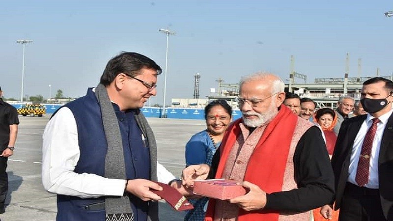 सीएम धामी ने पीएम मोदी को दिल्ली लौटते हुए अल्मोड़ा की बाल मिठाई और पहाड़ी टोपी भेंट की