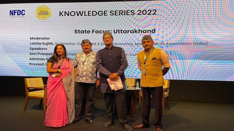 देहरादून, खबर न्यू इंडिया (न्यूज़ डेस्क): गोवा में चल रहे 53वें अन्तर्राष्ट्रीय फिल्म महोत्सव में आज नॉलेज सीरीज में उत्तराखण्ड में फ़िल्म शूटिंग को लेकर चर्चा की गई। इस दौरान विशेष प्रमुख सचिव सूचना अभिनव कुमार ने चर्चा में प्रतिभाग कर रहे विशेषज्ञों का उत्तराखण्ड की पारंपरिक पहाड़ी टोपी और अंग वस्त्र भेंट कर स्वागत किया। मुख्य वक्ता के तौर पर अध्यक्ष केंद्रीय फ़िल्म प्रमाणन बोर्ड प्रसून जोशी ने कहा कि उत्तराखण्ड में शूटिंग के लिये अनुकूल माहौल है। इस क्षेत्र में युवाओं को दिशा देने के साथ ही सिनेमोग्राफी, स्क्रिप्ट लेखन के साथ ही अन्य फ़िल्म कलाओं में भी आगे बढ़ना है। उन्होंने कहा कि उत्तराखण्ड के मुख्यमंत्री पुष्कर सिंह धामी प्रदेश को फ़िल्म डेस्टिनेशन के रूप में विकसित करने के लिए कार्य कर रहे हैं। उत्तराखण्ड में शूटिंग के लिये अनुकूल माहौल है, यहाँ के कलाकार फ़िल्म उद्योग में क्या योगदान दे सकते हैं इस ओर ध्यान दिया जाना चाहिए।