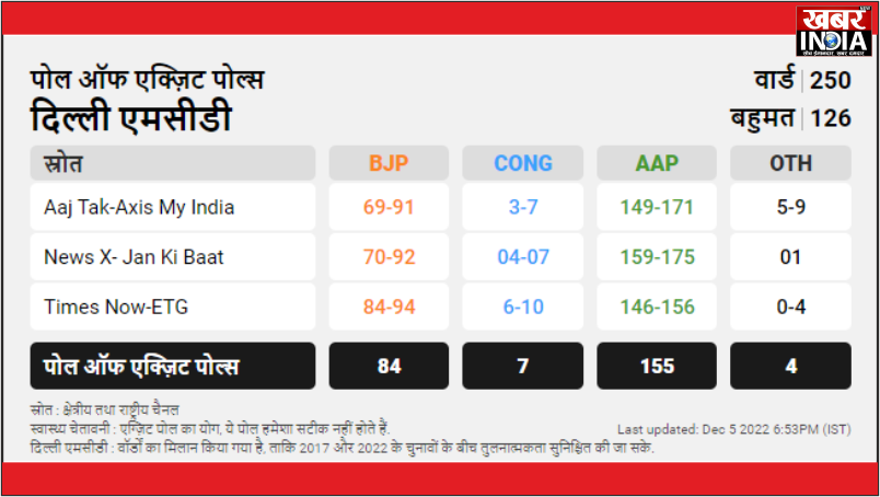 दिल्ली ,खबर न्यू इंडिया (न्यूज़ डेस्क): दिल्ली नगर निगम चुनाव के एक्जिट पोल में अरविंद केजरीवाल की आम आदमी पार्टी बड़ी जीत की ओर बढ़ती नजर आ रही है. आज तक के एक्जिट पोल में AAP को एमसीडी चुनाव में 250 में से 149 से 171 वार्डों पर जीत मिलती बताई गई हैं. Times Now के एक अन्य exit poll में AAP को 146 से 156 सीटें मिलती बताई गई हैं. Aaj Takके Exit Poll में बीजेपी को 69 से 91 के बीच वार्डों में जीत मिलने का अनुमान लगाया गया है जबकि Time Nows ने पार्टी को 84 से 94 के बीच वार्डों में जीत मिलने की संभावना जताई है. दोनों ही चैनलों के exit polls कांग्रेस पार्टी की खस्ता हालत का अनुमान लगा रहे हैं. आपको बता दे दिल्ली एमसीडी में पिछले 15 सालों से बीजेपी का कब्ज़ा हैं