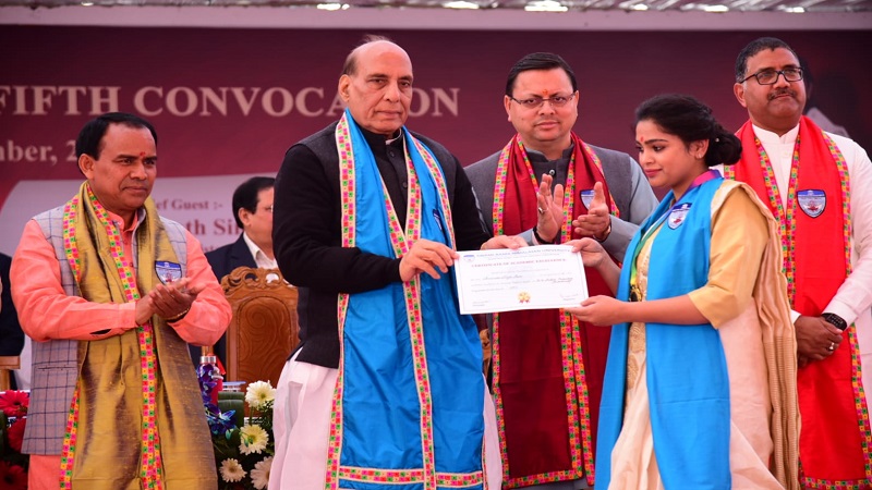 दीक्षान्त समारोह को सम्बोधित करते हुए केन्द्रीय रक्षा मंत्री ने कहा कि दीक्षान्त समारोह शिक्षा का नहीं अपितु संस्कारों का सन्देश देता है। संस्कार जीवन में महत्वपूर्ण हैं। शिक्षा कल्याणकारी अथवा विनाशकारी में से कुछ भी हो सकती है, यह विद्यार्थियों के संस्कारों पर निर्भर करता है। दीक्षान्त समारोह शिक्षा का अन्त नहीं है। सीखने के प्रक्रिया निरन्तर चलती रहती है। जीवन में सफलता और असफलता साथ-साथ चलती रहती है। असफलताओं से डरने के स्थान पर उनसे सीखना आवश्यक है। युवाओं को इस बार के फीफा वर्ल्ड कप से भी सीखना चाहिए। खेल जगत से टीम भावना सबको सीखनी चाहिए। प्रधानमंत्री नरेन्द्र मोदी भी इसी टीम भावना के साथ देश के लिए कार्य कर रहे है। प्रधानमंत्री जी का ‘‘सबका साथ सबका विकास तथा सबका प्रयास’’ का मंत्र इसी टीम भावना पर आधारित है। देश के विकास एवं प्रगति में सभी वर्गों की भागीदारी सुनिश्चित की जा रही है। इसके कारण आने वाले समय में भारत में अपार संभावनाओं के द्वार खुलने वाले हैं। इस बात को कोई नकार नही सकता कि अर्न्तराष्ट्रीय स्तर पर भारत की छवि बढ़ी है। भारत का कद ऊंचा हुआ है। आज भारत के विचारों को अर्न्तराष्ट्रीय मंचों पर गम्भीरता से सुना जा रहा है। केन्द्रीय रक्षा मंत्री ने कहा कि आज की युवा पीढ़ी जनरेशन जी से है। आप सभी डिजटल, आई टी, इन्टरनेट की पीढ़ी है। आपके लिए तो आई टी का अर्थ ही इन्फोर्मेशन टेक्नॉलॉजी इंडिया टुडे है। इसलिए आप यह बात बखूबी समझेंगे कि भारत में इन्फोर्मेशन टेक्नॉलॉजी ने बहुत परिवर्तन ला दिया है। अब तो 5 जी का दौर आ गया है। आज भारत डिजिटल टेक्नॉलजी के क्षेत्र में ग्लोबल मैप पर अपने पहचान बना रहा है। 2014 में जहां भारत में 400 से 500 स्टार्टअप हुआ करते थे, आज 2022 में हमारे प्रतिभाशाली युवाओं के कारण अस्सी हजार से अधिक स्टार्ट अप हो चुके है। यह साधारण उपलब्धि नहीं है। भारत में उद्यमी युवाओं ने सौ से अधिक यूनिकॉर्न बनाए हैं। हर महीने 7 से 8 यूनिकॉर्न आ रहे हैं। आज युवा अपनी प्रतिभा, क्षमता और परिश्रम से बड़े से बड़ा लक्ष्य प्राप्त कर सकते हैं। कुछ दिन पूर्व प्रधानमंत्री ने आईएनएस विक्रान्त का लोकार्पण किया। इस प्रकार भारत विश्व का छठा देश बन गया है जो एयरक्राफ्ट कैरियर बनाने लगा है। हमारे देश के वैज्ञानिकों ने सबसे ताकतवर वॉरशिप निमार्ण का भी कार्य किया है। यह भारत के युवाओं के प्रतिभा, नए आत्मविश्वास से ही संभव हो पाया है। आज विश्व के प्रतिष्ठित कम्पनियों के सीईओ भारतीय तथा भारतीय मूल के हैं। केन्द्रीय रक्षा मंत्री ने कहा कि युवा इंडीविजुवल अचीवमेंट से आगे बढ़कर सोशल बेटरमेंट के बारे में सोचेगे तो बड़ी सफलताएं प्राप्त करेंगे। यदि आप अपने ज्ञान का प्रयोग समाज एवं मान