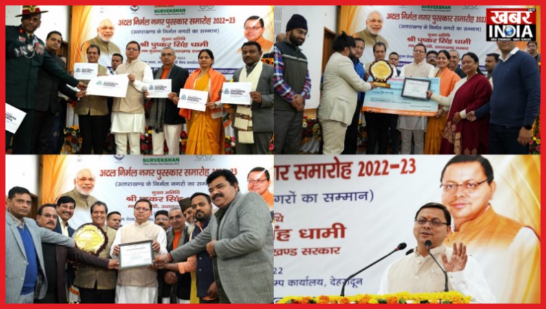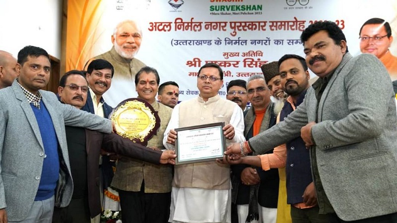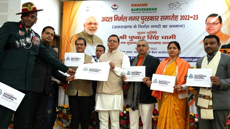 मुख्यमंत्री पुष्कर सिंह धामी ने सोमवार को मुख्यमंत्री आवास स्थित मुख्य सेवक सदन में स्वच्छ सर्वेक्षण-2022 में बेहतर प्रदर्शन करने वाले निर्मल नगरों को अटल निर्मल नगर पुरस्कार 2023 से सम्मानित किया। इस अवसर पर प्रदेश के 09 निकायों को अटल निर्मल पुरस्कार एवं राष्ट्रीय स्तर पर पुरस्कृत 05 निकायों को स्वच्छ गौरव सम्मान प्रदान किया गया। मुख्यमंत्री ने कार्यक्रम के दौरान दून कैंट स्वच्छता चौपाल का लोगो लाँच भी किया।