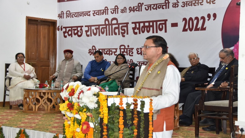 मुख्यमंत्री ने कहा कि प्रधानमंत्री नरेन्द्र मोदी के मार्गदर्शन में उत्तराखण्ड की डबल इंजन की सरकार स्व. नित्यानंद स्वामी के पदचिन्हों पर चलते हुए राज्य के विकास हेतु प्रतिबद्ध है। श्रद्धेय स्व. स्वामी के स्वच्छ राजनीतिक जीवन से प्रेरित होकर ही हमारी सरकार उत्तराखंड राज्य को “सर्वश्रेष्ठ राज्य“ बनाने के अपने संकल्प को पूर्ण करने के लिए दिन-रात कार्य कर रही है। हमारी सरकार राज्य में शिक्षा, स्वास्थ्य और सुशासन को सुदृढ़ बनाने के लिए विशेष रूप से प्रयासरत है। मुख्यमंत्री ने उन्हें स्वच्छ राजनीतिज्ञ सम्मान से सम्मानित किये जाने पर आभार व्यक्त करते हुए कहा कि व्यक्तिगत तौर पर उनकी भी यही कोशिश रहती है कि जनता की सेवा हेतु जो काम किए जाएं, वह पूर्ण रूप से “सेवा परमो धर्मः“ के मंत्र को सार्थक करने के लिए ही हो। समिति ने मुझे “स्वच्छ राजनीतिज्ञ सम्मान“ से अलंकृत करने योग्य समझा, इसे भी अपना गौरव समझता हूं। यह सम्मान मुझे नया उत्तराखण्ड बनाने के लिये नई ऊर्जा देने का कार्य करेगा।