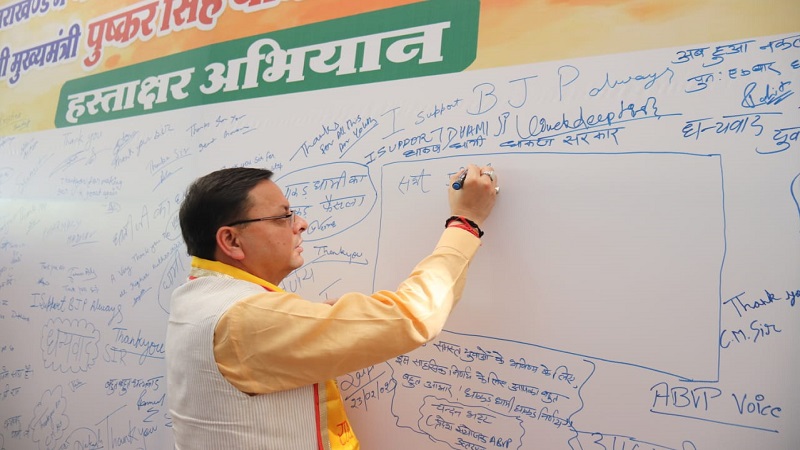 रुद्रपुर/देहरादून, खबर न्यू इंडिया (न्यूज़ डेस्क): मुख्यमंत्री पुष्कर सिंह धामी ने गुरुवार को राधा स्वामी सत्संग व्यास रुद्रपुर में प्रतियोगी परीक्षाओं की तैयारी कर रहे अभ्यर्थियों एवं विद्यार्थियों द्वारा आयोजित हस्ताक्षर अभियान में प्रतिभाग किया। मुख्यमंत्री द्वारा प्रतियोगी परीक्षाओं में पारदर्शिता एवं सुचिता को सुनिश्चित कराने के लिए राज्य में नकल विरोधी कानून लाये जाने पर प्रतियोगी परीक्षाओं की तैयारी कर रहे अभ्यर्थियों एवं विद्यार्थियों ने मुख्यमंत्री का आभार व्यक्त किया। मुख्यमंत्री ने प्रदेश में सभी प्रतियोगी परीक्षाएं नकलविहीन होंगी, पारदर्शिता के साथ होंगी, आप अपनी परीक्षाओं की तैयारियां करें, हमारे भाई-बहनों का समय भी खराब नहीं होगा, भर्तियां कैलेण्डर के अनुसार होंगी’’ लिखकर अपने हस्ताक्षर भी किये।