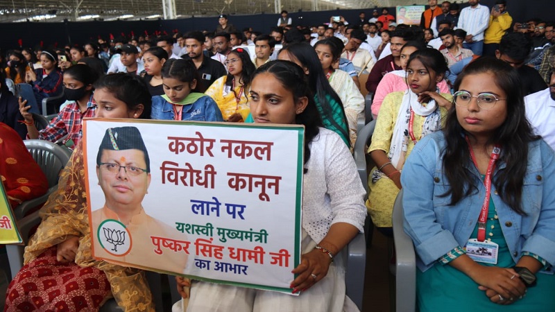 मुख्यमंत्री पुष्कर सिंह धामी ने कहा कि राज्य में भर्ती घोटाले नासूर एवं कैंसर की तरह फैल रहा था, जिसकी सरजरी करना बहुत जरूरी था। इस बार कुछ छात्र-छात्राओं द्वारा वीपीडीओ भर्ती परीक्षा में भी पेपर लीक होने की आशंका जताई गई थी, जिसकी कराने पर प्रारम्भिक रूप से ये लगने लगा कि इस परीक्षा में गड़बड़ी हुई है। उन्होने कहा तभी से हमने तय किया कि यही नही हम पुरानी सभी भर्तियों की जांच करायेगें और हमने जांच का निर्णय लिया जिसमें जांच करने पर इस अपराध में जो संलिप्त थे वो 60 से भी ज्यादा लोग जेल जा चुके हैं। उन्होंने कहा कि भर्ती परीक्षाओं में होने वाली गड़बड़ी को जड़ से खत्म करने के लिए हमने भारतवर्ष का सबसे सख्त कानून बनाया है जिसमें नकल कराने वाले व्यक्ति के लिए उम्र कैद तक का भी प्रावधान करने के साथ ही सारी सम्पत्ति जब्त करने का भी प्रावधान किया गया है। उन्होंने कहा कि जो अभ्यर्थी नकल करने में एक बार पकड़ा गया तो 03 साल तक अगर वह इसमें फिर से संलिप्त पाया जाता है तो अगले 10 वर्षो तक वह किसी परीक्षा में भाग नही ले सकता है और पूरे देश का सर्वाधिक सख्त कानून है। उन्होने कहा कि बच्चे हमारे देश का भविष्य हैं, उनके भविष्य से कोई खिलवाड़ न करे उनकी उम्मीदों को ना तोडे़, इन सभी बातों पर गहनता से विचार करते हुए हमने ये नकल विरोधी सख्त कानून बनाया।