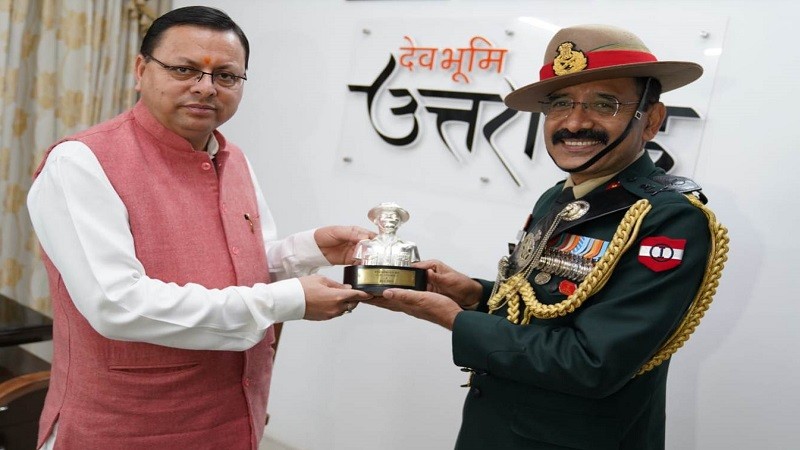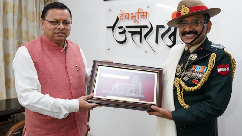सीएम धामी से लेफ्टि. जनरल गजेन्द्र जोशी, ए.वी.एस.एम., एस.एम 01 कोर कमाण्डर ने शिष्टाचार की भेंट