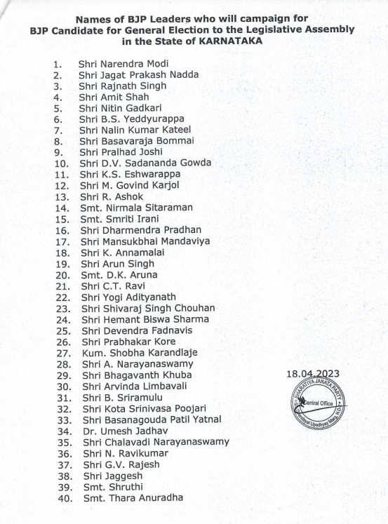 खबर न्यू इंडिया (न्यूज़ डेस्क): कर्नाटक विधानसभा चुनाव के मद्देनजर सत्तारूढ़ बीजेपी ने अपने स्टार प्रचारकों की सूची जारी कर दी है. स्टार प्रचारक की सूची में पीएम नरेंद्र मोदी, केंद्रीय गृहमंत्री अमित शाह, बीजेपी के राष्ट्रीय अध्यक्ष जेपी नड्डा, केंद्रीय रक्षामंत्री राजनाथ सिंह, यूपी के सीएम योगी आदित्यनाथ, केंद्रीय मंत्री स्मृति ईरानी समेत 40 लोगों के नाम शामिल हैं.
