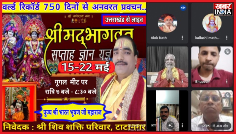 देहरादून, खबर न्यू इंडिया (न्यूज़ डेस्क) : श्रीमद् भागवत ज्ञान यज्ञ सप्ताह शिव शक्ति परिवार टाटानगर झारखंड द्वारा वर्ल्ड रिकॉर्ड 753 दिनों से अनवरत चल रही श्रीमद् भागवत ज्ञान यज्ञ सप्ताह में 750 वें दिन से उत्तराखंड देहरादून से लाइव गूगल मीट पर 15 मई से 22 मई तक परम पूज्य आचार्य भारत भूषण जी महाराज द्वारा सांय7:00 से 8:40 तक दिव्य भागवत कथा से संपूर्ण भारत की अनेक अनेक प्रांतों से भक्तजन गूगल मीट पर जोड़ करके महाराज श्री से दिव्य कथा को श्रवण कर आनंद प्रद हो रहे हैं हम सब उत्तराखंड देहरादून वासियों का बड़ा सौभाग्य कि दिव्य वर्ल्ड रिकॉर्ड अनुव्रत प्रवचन में आचार्य भारत भूषण शास्त्री जी महाराज के मुखारविंद से हमें कथा श्रवण को प्राप्त हो रही है