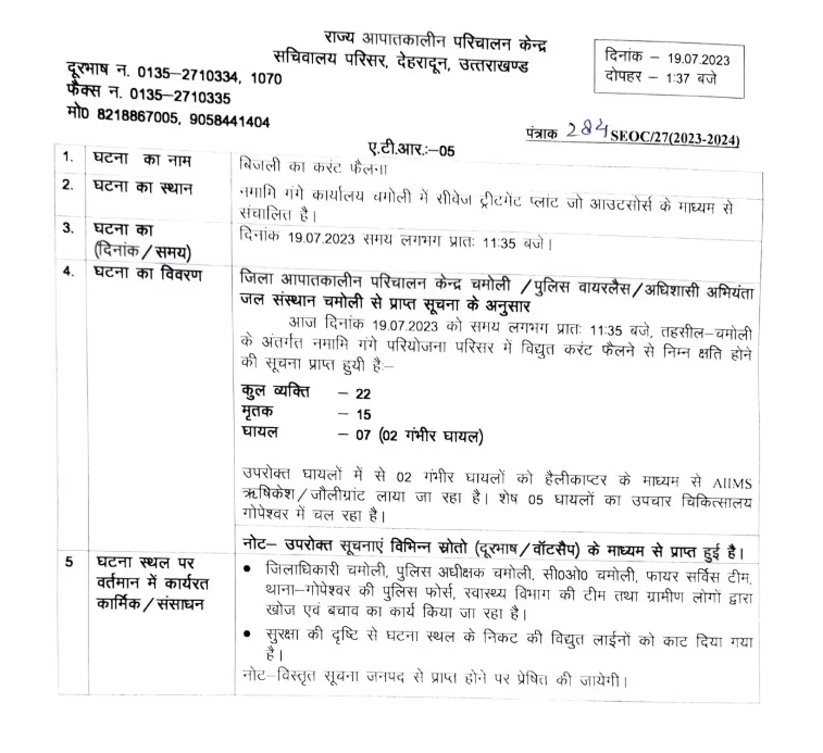 भारी बारिश के बाद उत्तराखंड के चमोली, हरिद्वार, रुद्रप्रयाग समेत कई जिलों में बाढ़ के हालात बने हुए हैं. इसी बीच चमोली में बुधवार को अलकनंदा नदी के किनारे एक ट्रांसफॉर्मर फटने के कारण करीब 15 लोगों की मौत हो गई है. बता दें कि करंट लगने से झुलसे लोगों को जिला चिकित्सालय लाया गया, जहां से उन्हें ऋषिकेश एम्स लाया जा रहा है।। राज्य आपदा परिचालन केंद्र के अनुसार घटना के समय 22 लोग मौके पर उपस्थित थे।