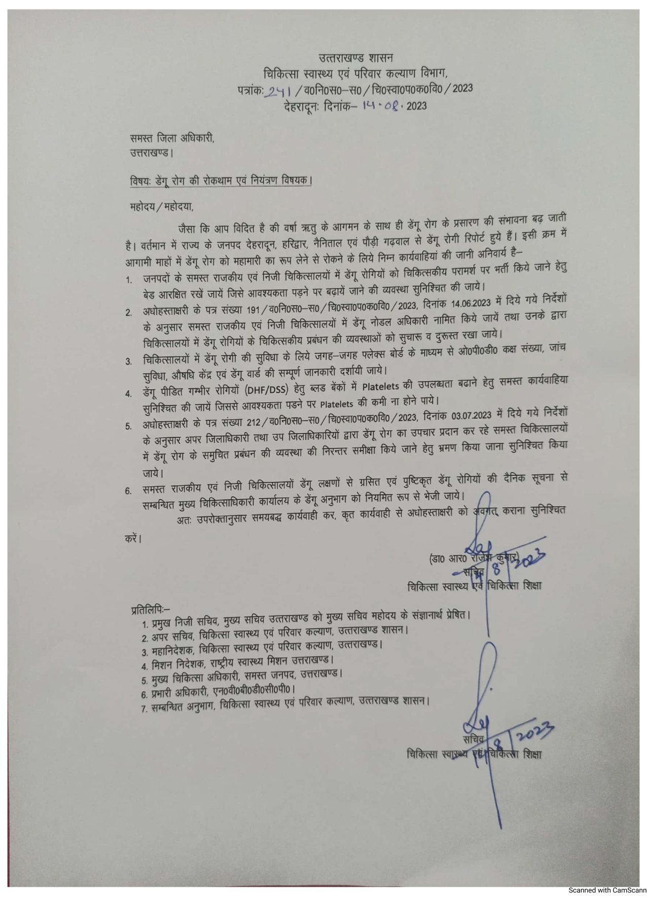 स्वास्थ्य सचिव डॉ आर राजेश कुमार ने राज्य के सभी जिलाधिकारियों को डेंगू रोग की रोकथाम एवं नियंत्रण के लिए पत्र लिखा है। अपने पत्र में स्वास्थ्य सचिव ने स्पष्ट किया हे कि वर्षा ऋतु के आगमन के साथ ही डेंगू रोग के प्रसारण की संभावना बढ़ जाती है। वर्तमान में राज्य के जनपद देहरादून, हरिद्वार, नैनिताल एवं पौड़ी गढ़वाल से डेंगू रोगी रिपोर्ट हुये हैं। इसी क्रम में आगामी माहों में डेंगू रोग को महामारी का रूप लेने से रोकने के लिये निम्न कार्यवाहियां की जानी अनिवार्य है।
