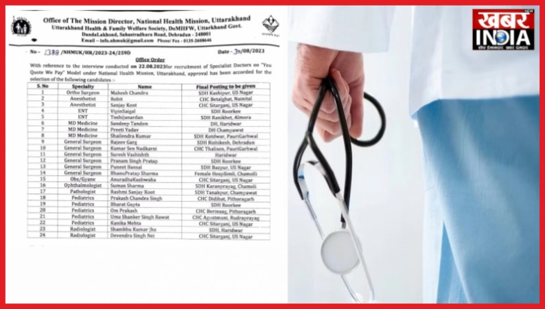 देहरादून, खबर न्यू इंडिया (न्यूज़ डेस्क)। उत्तराखण्ड में स्पेशलिस्ट और सुपर स्पेशलिस्ट डॉक्टरों की पहली तैनाती कर दी गई है। डॉक्टरों को ‘यू कोट-वी पे‘ योजना के तहत संविदा पर तैनाती दी गई है। स्पेशलिस्ट और सुपर स्पेशलिस्ट डॉक्टरों को 4 लाख से 6 लाख रुपये महीने का वेतन दिया जाएगा। स्वास्थ्य सचिव डा. आर राजेश कुमार ने कहा कि स्पेशलिस्ट और सुपर स्पेशलिस्ट डॉक्टरों की तैनाती से राज्य के दूरस्थ क्षेत्रों में स्वास्थ्य सुविधाओं का लाभ मिल पाएंगी। स्वास्थ्य विभाग लम्बे समय से राज्य के पर्वतीय जिलों में स्पेशलिस्ट और सुपर स्पेशलिस्ट डाक्टरों की कमी को दूर करने की कवायद कर रहा है। जिसके पहले चरण में 24 डॉक्टरों का चयन किया गया है। इनमें पैथोलॉजिस्ट, गायनोलॉजिस्ट, एनेस्थेटिक, सर्जन, पीडियाट्रिश, ऑर्थाेपेडिक डॉक्टरों को तैनाती दी गई है। राष्ट्रीय स्वास्थ्य मिशन की लोकप्रिय योजना ‘यू कोट-वी पे’ के माध्यम से स्पेशलिस्ट डॉक्टरों की संविदा पर तैनाती की गई है। सभी डॉक्टरों को तैनाती के ऑडर जारी कर दिए गए हैं।