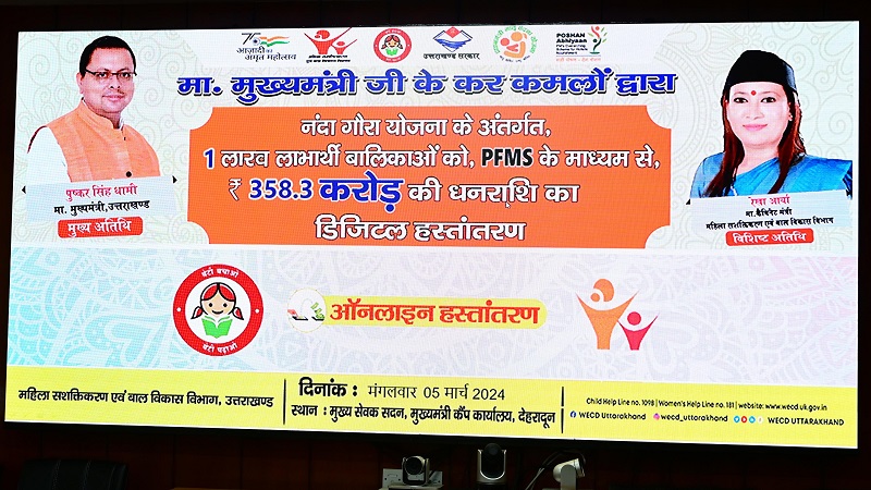 देहरादून, खबर न्यू इंडिया (न्यूज़ डेस्क): मुख्यमंत्री पुष्कर सिंह धामी ने मंगलवार को सचिवालय में महिला सशक्तिकरण एवं बाल विकास विभाग की नंदा गौरा योजना के अंतर्गत एक लाख लाभार्थी बालिकाओं को पी.एफ.एम.एस के माध्यम से 358.3 करोड़ तथा मुख्यमंत्री वात्सल्य योजना के अंतर्गत कुल 3.58 करोड़ की धनराशि का डिजिटल हस्तांतरण किया। नंदा गौरा योजना के अन्तर्गत बालिका के जन्म पर रुपये-11,000/- एवं 12वीं पास करने पर रुपये-51,000/- की धनराशि उपलब्ध कराई गई जिसमें वित्तीय वर्ष 2022-23 की जन्म वाली-11948 बालिकायें तथा 12वीं पास-32353 बालिकाओं तथा वर्ष 2023-24 के जन्म वाली-6539 बालिकायें तथा 12वीं पास-24408 बालिकाएं शामिल हैं। इसमें मुख्यमंत्री द्वारा विधानसभा में की गई घोषणा के क्रम में पूर्व संचालित नंदा देवी कन्या योजना के अन्तर्गत वित्तीय वर्ष 2009-10 से वित्तीय वर्ष 2016-17 तक लाभ से वंचित रह गई-32,3,61 जन्म वाली बालिकाओं को रुपये 15,000/- की दर से लाभान्वित किया जाना भी शामिल है।