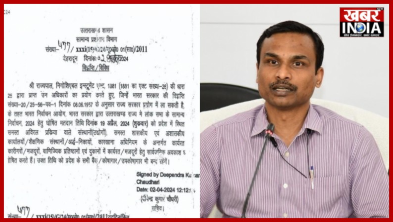 देहरादून, खबर न्यू इंडिया (न्यूज़ डेस्क) : उत्तराखंड सरकार ने सामान्य प्रशासन विभाग ने आदेश जारी करते हुए 19 अप्रैल को लोकसभा चुनाव मतदान के तहत प्रदेश के उद्योग इकाई, समस्त शासकीय और अशासकीय कार्यालयों, शैक्षणिक संस्थानों, कारखानों पर एक दिवसीय सार्वजनिक अवकाश घोषित किया है. उत्तराखंड में लोकसभा चुनाव 2024 के तहत पहले चरण में मतदान किए जाएंगे. मंगलवार को अपर मुख्य निर्वाचन अधिकारी विजय कुमार जोगदंडे की ओर से आदेश जारी किया गया है. जारी आदेश के अनुसार, उत्तराखंड सामान्य प्रशासन विभाग की ओर से जारी अवकाश के आदेश के जरिए निगोशिएबल इन्स्ट्रुमेंट एक्ट, 1881 (1881 का एक्ट संख्या-26) की धारा 25 से प्राप्त अधिकारों का प्रयोग करते हुए, राज्य में अवकाश लागू किया जा सकता है. ऐसे में सभी जिलाधिकारियों को निर्देश दिया गया है कि स्थानीय स्तर पर इसका व्यापक प्रचार प्रसार किया जाए ताकि मतदाता, मतदान के लिए इसका लाभ उठा सकें. उन्होंने कहा कि प्रयास किये जा रहे हैं कि सर्विस वोटरों का मतदान प्रतिशत लगभग शत प्रतिशत हो। पिछले लोक सभा चुनाव में उत्तराखण्ड के 90 हजार 845 सर्विस वोटरों में से 63 हजार 222 पोस्टल बैलेट प्राप्त हुए थे, जो कुल सर्विस वोटरों का लगभग 70 प्रतिशत था। अपर मुख्य निर्वाचन अधिकारी ने कहा कि राज्य में बनाए गये 11 हजार 729 पोलिंग बूथों में चुनावी पारदर्शिता को बनाए रखने के लिए विभिन्न व्यवस्थाएं की जाएगी। वहीं, इस बार उत्तराखंड में 81 लाख 67 हजार 568 मतदाता मतदान में भाग लेंगे. जबकि 93 हजार 962 वोटर्स सर्विस मतदाताओं के रूप में वोट करेंगे. 9 नवंबर 2022 को जारी अंतिम निर्वाचक नामावली की तुलना में 27 जनवरी को जारी किए गए अंतिम निर्वाचक नामावली में 82 हजार 080 मतदाता बढ़ गए हैं.