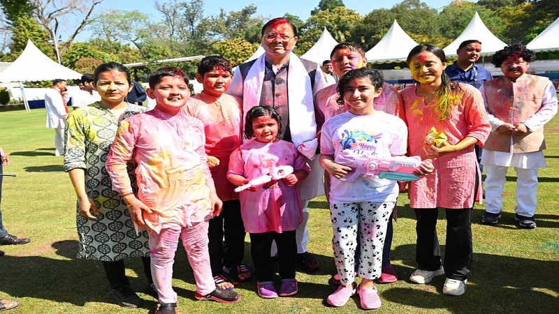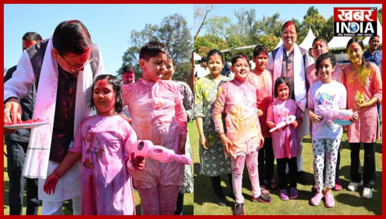 सीएम धामी ने नन्हे मुन्ने बच्चों के साथ रंग और गुलाल लगाकर खेली होली