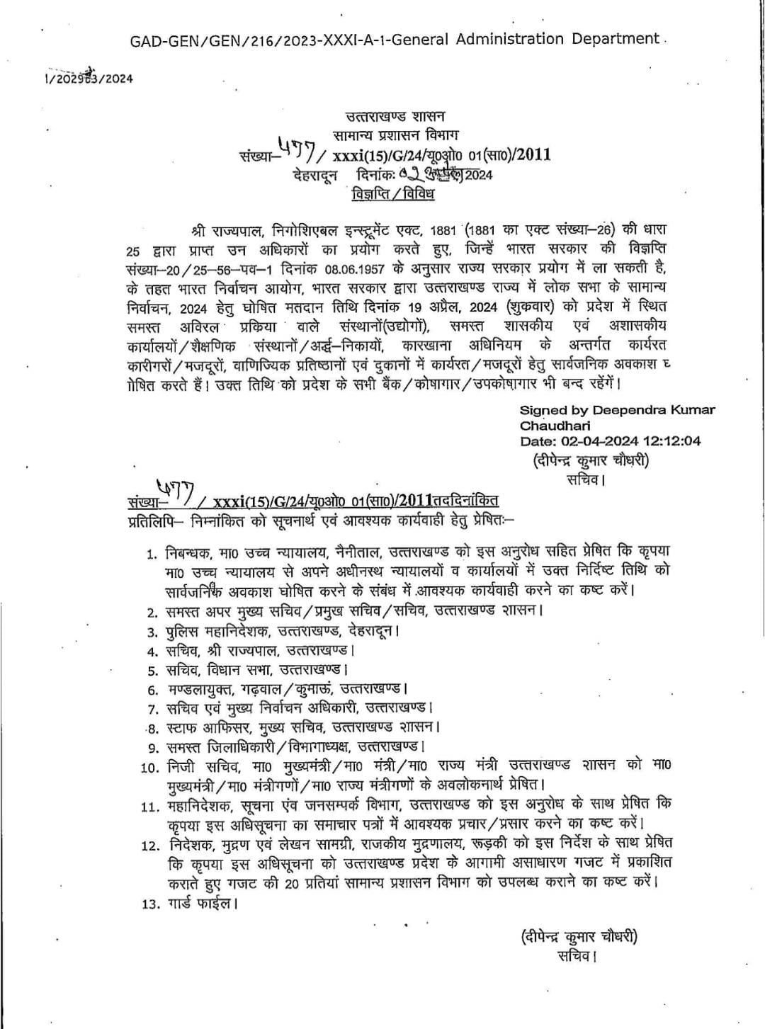 उत्तराखंड में 19 अप्रैल को रहेगा सार्वजनिक अवकाश, शासनादेश जारी