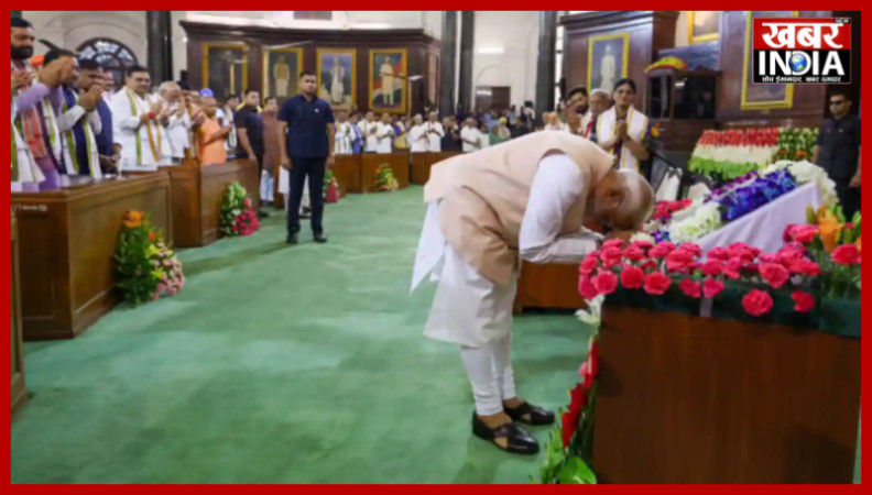 खबर न्यू इंडिया (न्यूज़ डेस्क): नरेंद्र मोदी को नेता चुनने के लिए आज (राष्ट्रीय जनतांत्रिक गठबंधन) यानी एनडीए के नवनिर्वाचित सांसदों की बैठक हुई. इस बैठक में नरेंद्र मोदी को एनडीए संसदीय दल का नेता चुना गया. इस दौरान नरेंद्र मोदी ने भारत के संविधान को अपने माथे से लगाया। इसके बाद उन्हें सर्वसम्मति से राजग संसदीय दल का नेता चुन लिया गया। इसके बाद राजग के नेता राष्ट्रपति द्रौपदी मुर्मू से मिलकर सरकार बनाने का दावा पेश करेंगे। इसके बाद मोदी रविवार को लगातार तीसरी बार देश के प्रधानमंत्री पद की शपथ लेंगे। पुराने संसद भवन में एनडीए संसदीय दल की बैठक में राजनाथ सिंह ने नरेंद्र मोदी को एनडीए संसदीय दल का नेता चुनने का प्रस्ताव रखा. इस दौरान सर्वसम्मति से यह प्रस्ताव पास किया गया. प्रस्ताव के बाद सभी नेताओं ने ध्वनि मत से मोदी को अपना नेता चुन लिया।प्रस्ताव के दौरान टीडीपी चीफ चंद्रबाबू नायडू और बिहार के मुख्यमंत्री नीतीश कुमार भी मंच पर मौजूद रहे. वहीं नीतीश कुमार ने जेडीयू की तरफ से नरेंद्र मोदी को भारत के प्रधानमंत्री पद के लिए समर्थन दिया. उन्होंने कहा,'10 साल से ये प्रधानमंत्री हैं. फिर प्रधानमंत्री बनने जा रहे हैं. पूरे देश की सेवा है पूरा भरोसा है जो कुछ भी बचा है अगली बार ये सब पूरा कर देंगे, जो भी राज्य का है. हमलोग पूरे तौर पर सब दिन इनके साथ रहेंगे.