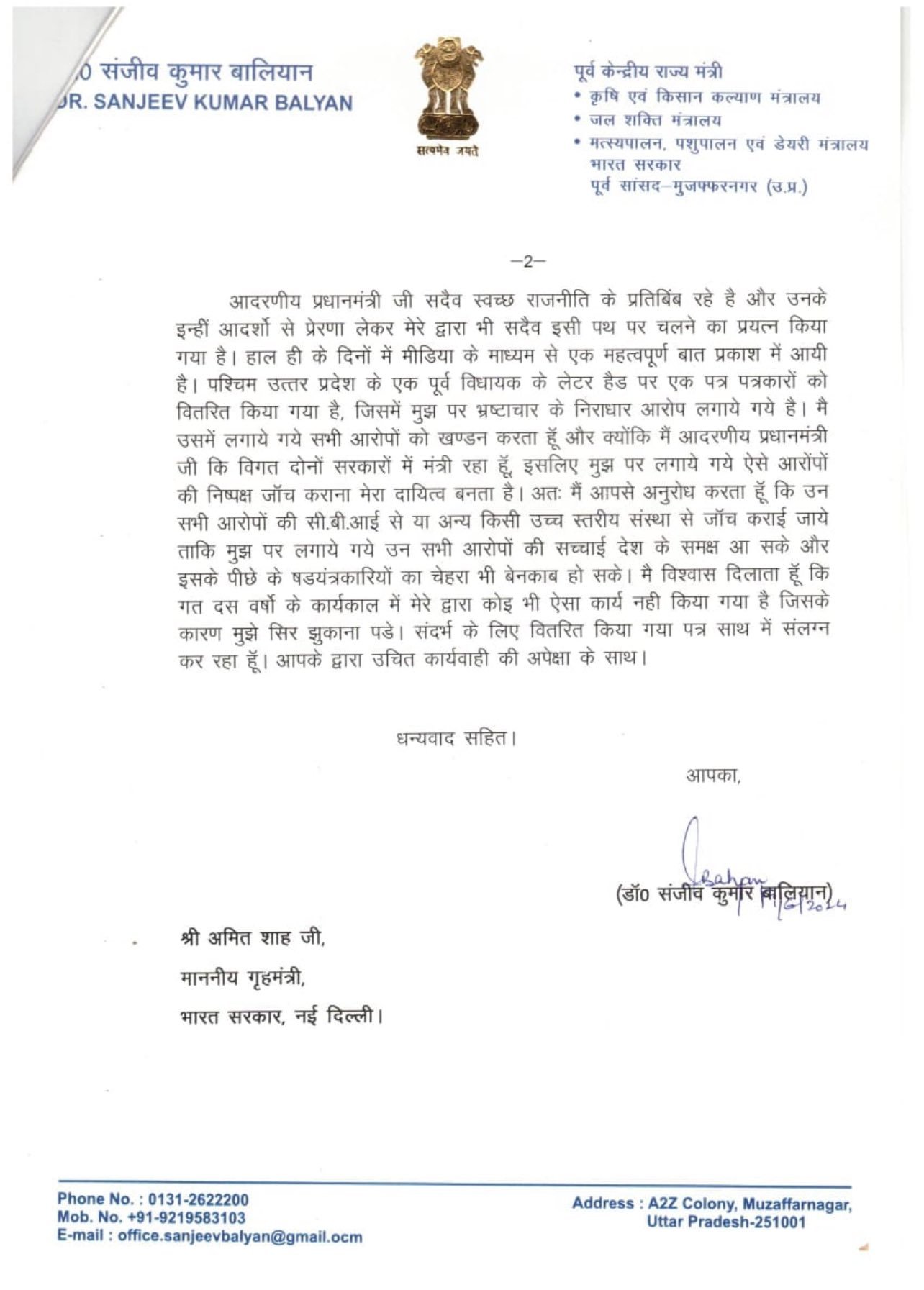 संजीव बालियान ने आरोपों पर कहा, ''हाल ही के दिनों में मीडिया के माध्यम से एक महत्वपूर्ण बात प्रकाश में आई है. पश्चिम उत्तर प्रदेश के एक पूर्व विधायक के लेटर हैड पर एक पत्र पत्रकारों को वितरित किया गया है, जिसमें मुझ पर भ्रष्टाचार के निराधार आरोप लगाए गए है. मै उसमें लगाए गए सभी आरोपों को खंडन करता हूं और क्योंकि मैं प्रधानमंत्रीकि विगत दोनों सरकारों में मंत्री रहा हूं, इसलिए मुझ पर लगाये गये ऐसे आरोपों की निष्पक्ष जांच कराना मेरा दायित्व बनता है. मैं आपसे अनुरोध करता हूं कि उन सभी आरोपों की सीबीआई से या अन्य किसी उच्च स्तरीय संस्था से जांच कराई जाए, ताकि मुझ पर लगाये गये उन सभी आरोपों की सच्चाई देश के समक्ष आ सके और इसके पीछे के षडयंत्रकारियों का चेहरा भी बेनकाब हो सके.''