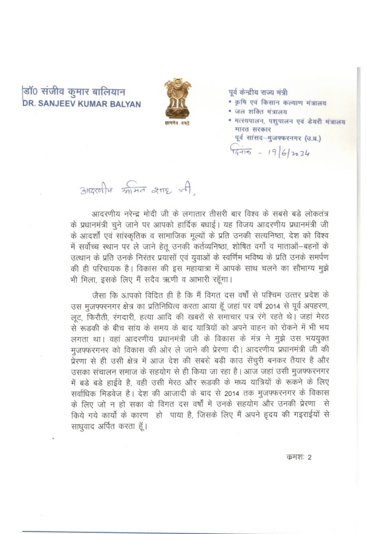 केंद्रीय गृह मंत्री अमित शाह को लिखी चिट्ठी में संजीव बालियान ने लिखा नरेंद्र मोदी लगातार तीसरी बार विश्व के सबसे बड़े लोकतंत्र के प्रधानमंत्री चुने जाने पर आपको हार्दिक बधाई. यह विजय प्रधानमंत्री के आदर्शों एवं सांस्कृतिक व सामाजिक मूल्यों के प्रति उनकी सत्यनिष्ठा, देश को विश्व में सर्वोच्च स्थान पर ले जाने हेतू उनकी कर्तव्यनिष्ठा, शोषित वर्गो व माताओं-बहनों के उत्थान के प्रति उनके निरंतर प्रयासों एवं युवाओं के स्वर्णिम भविष्य के प्रति उनके समर्पण की ही परिचायक है. विकास की इस महायात्रा में आपके साथ चलने का सौभाग्य मुझे भी मिला, इसके लिए मैं सदैव ऋणी व आभारी रहूंगा.''