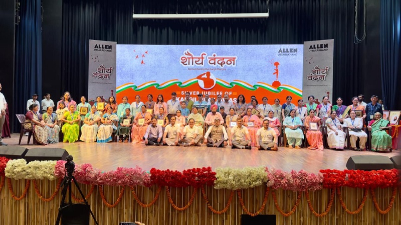 एलन कॅरियर इंस्टीट्यूट प्राइवेट लिमिटेड की ओर से देहरादून में करगिल विजय के 25वें वर्ष के तहत शौर्य वंदन कार्यक्रम हिमालयन कल्चरल सेंटर, गढ़ीकेंट, देहरादून में आयोजित किया गया। कार्यक्रम में करगिल युद्ध में देहरादून और आस-पास अलमोड़ा, उधमसिंह नगर, चमोली, पौड़ी गढ़वाल, टिहरी, हरिद्वार, पिथौरागढ, उत्तरकाशी, रूद्रप्रयाग, नैनीताल 41 शहीदों के परिजनों का सम्मान किया गया। शहीदों के परिजनों को 11-11 हजार के चेक, सम्मान पत्र सौंपे गए। इस दौरान शहीदों के परिजनों ने भी अपने अनुभव साझा किए। इस दौरान कई बार ऐसे क्षण भी आए जब हर किसी के आंख में आंसू आ गए। कार्यक्रम में शामिल विद्यार्थियों ने खड़े होकर शहीदों के सम्मान में तालियां बजाई और परिजनों को सेल्युट किया। समारोह में उत्तराखंड सरकार में सैनिक कल्याण एवं पुनर्वास मत्री गणेश जोशी ने शहीदों के समर्पण को सैल्युट करते हुए परिजनों को संवेदना जताई और शहीदों को देश का गौरव बताया। इसके साथ ही कार्यक्रम में डायरेक्टर सैनिक कल्याण देहरादून ब्रिगेडियर अमृत लाल, सचिव सैनिक कल्याण दीपेन्द्र चौधरी, कमांडेंट मिलिट्री कॉलेज देहरादून कर्नल राहुल अग्रवाल, चेयरमैन दून इंटरनेशल गु्रप ऑफ स्कूल्स डी एस मान एवं मुख्यमंत्री कार्यालय में मीडिया प्रभारी हरीश कोठारी भी मौजूद रहे। इस अवसर पर मुख्यमंत्री का संदेश भी पढ़कर सुनाया गया।