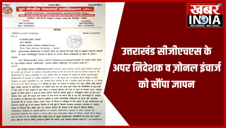 देहरादून, खबर न्यू इंडिया (न्यूज़ डेस्क) : दून केंद्रीय पेंशनर्स एसोसिएशन के अध्यक्ष रविन्द्र दत्त सेमवाल व महासचिव एस एस चौहान ने आज दून/उत्तराखंड सीजीएचएस के अपर निदेशक व ज़ोनल इंचार्ज डा. अश्वनी कुमार सेन्यारे से जीएमएस रोड़ स्थित उनके कार्यालय में मुलाक़ात की तथा 7 सूत्री मांगों का एक ज्ञापन उन्हें सौंपा जिसमें मांग की गईं कि "सीजीएचएस वेलनेस सेंटरों पर मरीजों की भारी भीड़ के चलते नंबर न आने से चिकित्सा परामर्श व दवा से रोजाना वंचित रहने वाले सैकड़ो मरीजों को अगले दिन प्राथमिकता दिये जाने की वैकल्पिक व्यवस्था की जाय.