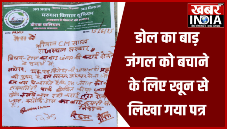 खबर न्यू इंडिया (न्यूज़ डेस्क) : जयपुर में डोल का बाड़ जंगल की कटाई के विरोध में आज एक अभूतपूर्व कदम उठाया गया। मरुधरा किसान यूनियन के प्रदेश अध्यक्ष दीपक बालियान सहित पर्यावरण प्रेमियों और सामाजिक कार्यकर्ताओं ने खून से मुख्यमंत्री भजनलाल शर्मा के नाम पत्र लिखा यह पत्र एक प्रतीकात्मक संदेश है — जंगलों के पक्ष में उठी एक गूंगी लेकिन गूंजती हुई पुकार।