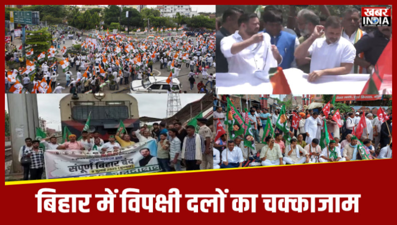 बिहार में आज इंडिया गठबंधन ने चक्काजाम का एलान किया है। नेता प्रतिपक्ष तेजस्वी यादव के नेतृत्व में पूरा विपक्ष आज राज्यभर में विरोध प्रदर्शन कर रहा है। बुधवार सुबह से ही राष्ट्रीय जनता दल, कांग्रेस, वामदल, विकासशील इंसान पार्टी के कार्यकर्ता सड़क पर उतर गए हैं। वह केंद्र सरकार और चुनाव आयोग के खिलाफ नारेबाजी कर रह हैं। बीते मंगलवार (08 जुलाई, 2025) को ही नेता प्रतिपक्ष तेजस्वी यादव ने बंद को सफल बनाने को लेकर अपील की थी. उन्होंने एक्स पर पोस्ट कर लिखा था, "9 जुलाई को पूरा बिहार बंद रहेगा! आप सभी साथी इस बंदी को सहयोग करें! वोटर लिस्ट में संशोधित नाम जोड़े जाने के क्रम में षड्यंत्रकारी नीति के विरुद्ध बंदी..!!