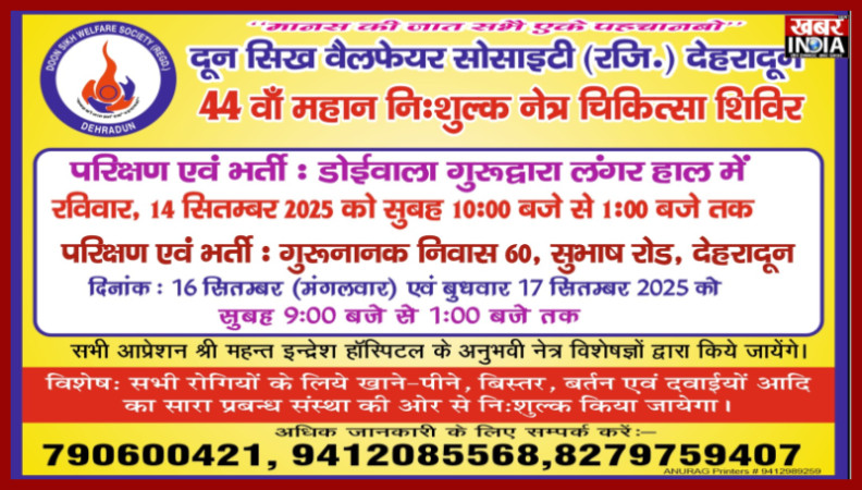 देहरादून, खबर न्यू इंडिया (न्यूज़ डेस्क) : 45 वर्ष पुरानी उत्तराखंड की सोसायटी दून सिख वेलफर सोसायटी अपना प्रतिष्ठित 44वाँ निःशुल्क नेत्र जाँच शिविर 14 सिंतबर को डोईवाला गुरुद्वारा लँगर हाल में प्रातः 10.00 बजे से 1.00 बजे तक एवँ देहरादून में 16 एवँ 17 सितंबर को प्रातः 9.00 बजे से 1.00 बजे तक आयोजित कर रही है। सोसायटी की एक लम्बी यात्रा है जिसने अपने नेत्र जाँच शिविर 1981 से प्रारम्भ की जहाँ शिविर में ही जाँच, ऑपरेशन, ठहरने, खाने की व्यवस्था होती थी क्योंकि ऑपरेशन के पश्चात एकदम नही छोड़ा जाता था क्योंकि ऑपरेशन आज की तरह लेज़र विधि से नही होते थे। 44 वर्षो में सोसायटी ने एक नाम उत्तराखंड एवँ उत्तर प्रदेश के आसपास के जिलों में प्राप्ति किया है। इसका सबूत आज सचिव को मुरादाबाद से एक फ़ोन है जिसमें मरीज ने कैम्प के बारे मे पूछा। उसने बताया कि पिछले वर्ष एक आंख का ऑपरेशन हुआ था और इस बार दूसरी का कराना है। सोसायटी ने गुरु सिंह सभा के आह्ववान पर पंजाब में बाढ़ पीड़ितों के लिये दवाइयां उनके माध्यम से प्रेषित की है ऐसा सचिव कृष्ण कुमार अरोड़ा ने अवगत कराया।