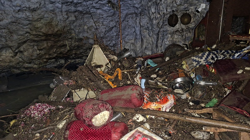 दरअसल मंगलवार को टपकेश्वर मंदिर में तमसा नदी के विकराल रूप के बाद तबाही का मंजर ऐसा था कि हर कोई हैरान था। राजधानी देहरादून के गढ़ीकैंट क्षेत्र में स्थित सालों पुराना प्राचीन टपकेश्वर महादेव मंदिर की तस्वीर बदल गई है. प्रदेश के हिमालय क्षेत्र पर हुई भारी बारिश और मालदेवता क्षेत्र में बादल फटने की घटना होने के बाद टपकेश्वर महादेव मंदिर के समीप से बह रही तमसा नदी पूरे उफान पर आ गई. तमसा नदी का जलस्तर लगभग 30 फीट ऊंचाई तक देखा गया. पहली बार ऐसा हुआ है, जब तमसा नदी पहाड़ से आए मलबे के साथ टपकेश्वर महादेव मंदिर की गुफा में भी चली गई. तपेश्वर महादेव मंदिर के चारों तरफ मौजूद अन्य मंदिर परिसर पूरी तरह से क्षतिग्रस्त हो गया. मंदिर में स्थापित करीब 25 फीट की हनुमानजी की मूर्ति के गले तक पानी पहुंच गया। सुबह करीब आठ बजे नदी का जलस्तर कम हुआ तो पुजारी समेत अन्य लोग मंदिर पहुंचे। इस दरमियान यहां का मंजर देख कांप उठे। मंदिर में पेड़ और बोल्डर पड़े मिले जिनसे रास्ते तक बंद हो गए थे। कई जगह रेलिंग टूटी मिली तो कही दीवार क्षतिगस्त हो गया था। मलबा भी कई फीट तक जमा मिला।