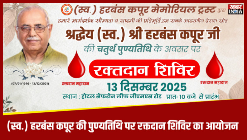 देहरादून, खबर न्यू इंडिया (न्यूज़ डेस्क): (स्व.) हरबंस कपूर मेमोरियल ट्रस्ट द्वारा सौम्यता व सादगी की प्रतिमूर्ति श्रद्धेय (स्व.) श्री हरबंस कपूर जी की चतुर्थ पुण्यतिथि के अवसर पर होटल सेफरोन लीफ जी एम एस रोड, देहरादून में एक रक्तदान शिविर का आयोजन किया जा रहा है.